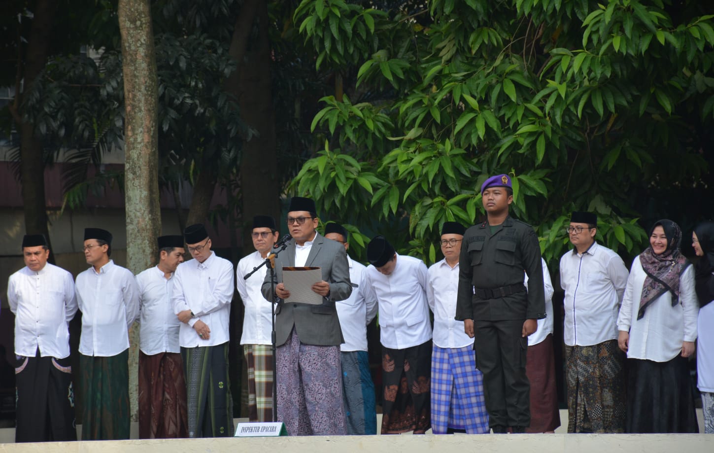 Mengenakan sarung, jas dan kopiah hitam, Prof Asep pun menyampaikan amanat dari Menteri Agama (Menag) Prof Nasaruddin Umar. Dalam amanatnya yang dibacakan Prof Asep, Menag menyampaikan belasungkawa terhadap insiden di Pondok Pesantren Al-Khoziny, Sidoarjo, Jawa Timur.